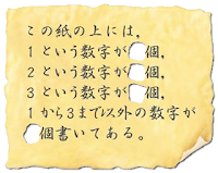 先日のこと. 書店で本をあさっているとニュートン別冊"数学パズル チャレンジ超問120"の裏表紙に右のようなパズルがあった. 虫食い問題で,穴の空いた部分に適当な数字を入れて正しい文書を完成させる問題. こういう面白いパズルはなかなか見つからないものなので気になっていた. 解いてみるとなるほどなという感じ. いきなり答えが見えては面白く無いので,解答は別のページに書く.